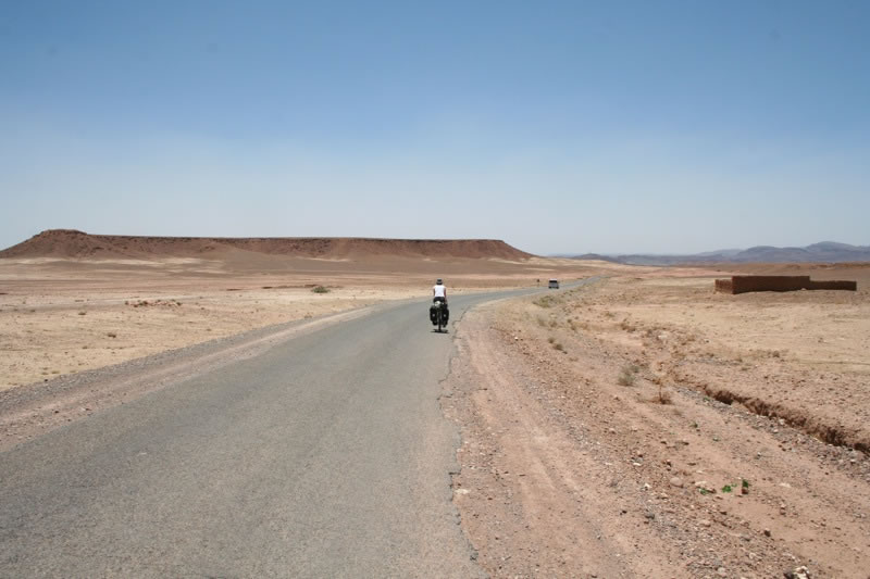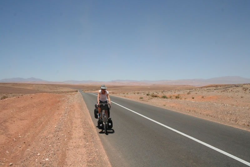 - Juli und August sind ok für Veloreisende wenn man im hohen Atlas bleibt oder den Toubkal besteigen will, denn bis im Mai kann dort Schnee liegen. In Imlil beispielsweise war’s sehr angenehm (1600 müM, 25-30°C). Unten um Marrakech und in Ouarzazate herrschen Backofentemperaturen und Trockenheit. Deshalb stiegen wir in Ouarzazate dann in den Bus der uns nach Azrou weiter nördlich brachte. Der mittlere Atlas ist schön grün und temperaturmässig im Sommer angenehm und mit seinen Wäldern absolut zu empfehlen (Ifrane, Azrou, 25-35°C). Unten in Meknes war’s dann wieder total heiss (47°C). In und um Tanger war’s sehr angenehm um die 25-30°C (und sonst kühlt ein Bad im Atlantik schnell ab). Eine Möglichkeit die Hitze zu umgehen wäre sehr früh am Morgen zu fahren, was wir jedoch nie geschafft haben.
